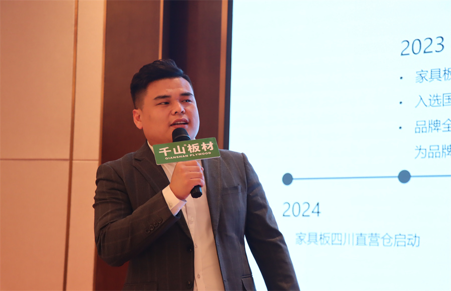 山東直營倉區域經理曹全震,帶大家回顧了千山的發展歷程。曹總分享到,千山家具板精準把控市場需求,通過品類優勢,持續圈粉消費者,接下來也將堅持創新、不斷升級產品。
