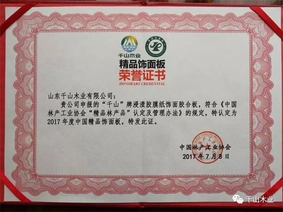 2017年7月,中國(guó)木質(zhì)林產(chǎn)品質(zhì)量提升與品牌建設(shè)高峰論壇在廣州舉行,千山應(yīng)邀參加,并榮獲2017年度“精品人造板(含飾面板)”、“精品裝飾紙”榮譽(yù)。