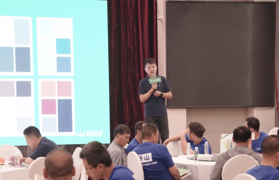 活動現場,千山板材大區經理史生平帶來2024年產品體系解讀。4大品類、127款潮流花色以及門墻柜系統的炫彩亮相,引起在場經銷商及合作伙伴的熱切關注。