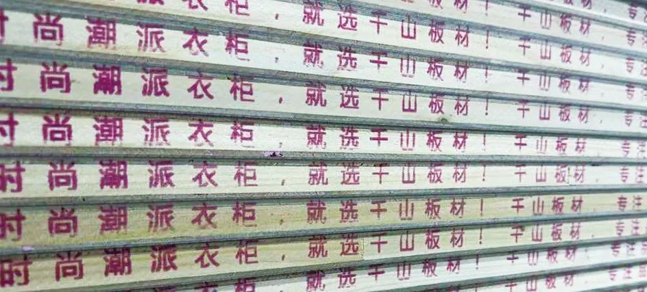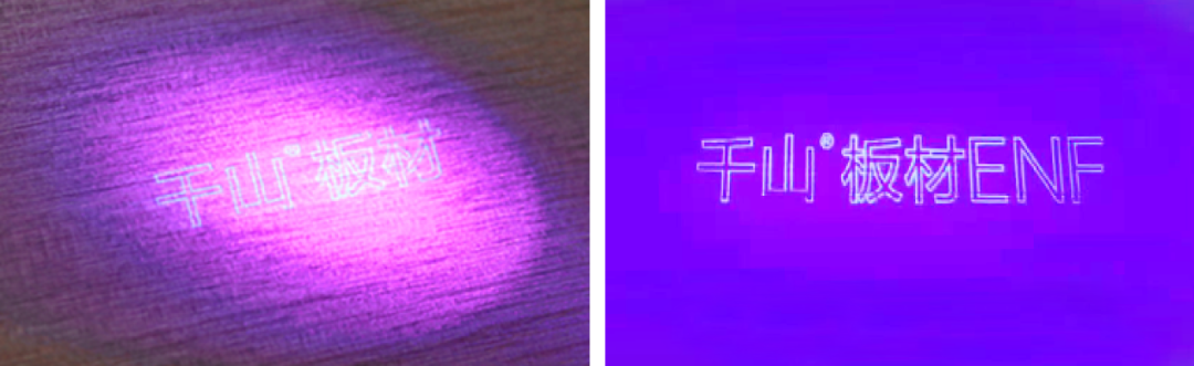千山板材每張板材表面都印有隱形防偽標識,使用紫光手電筒照射板材表面,顯現“千山板材”  “千山板材ENF”。
