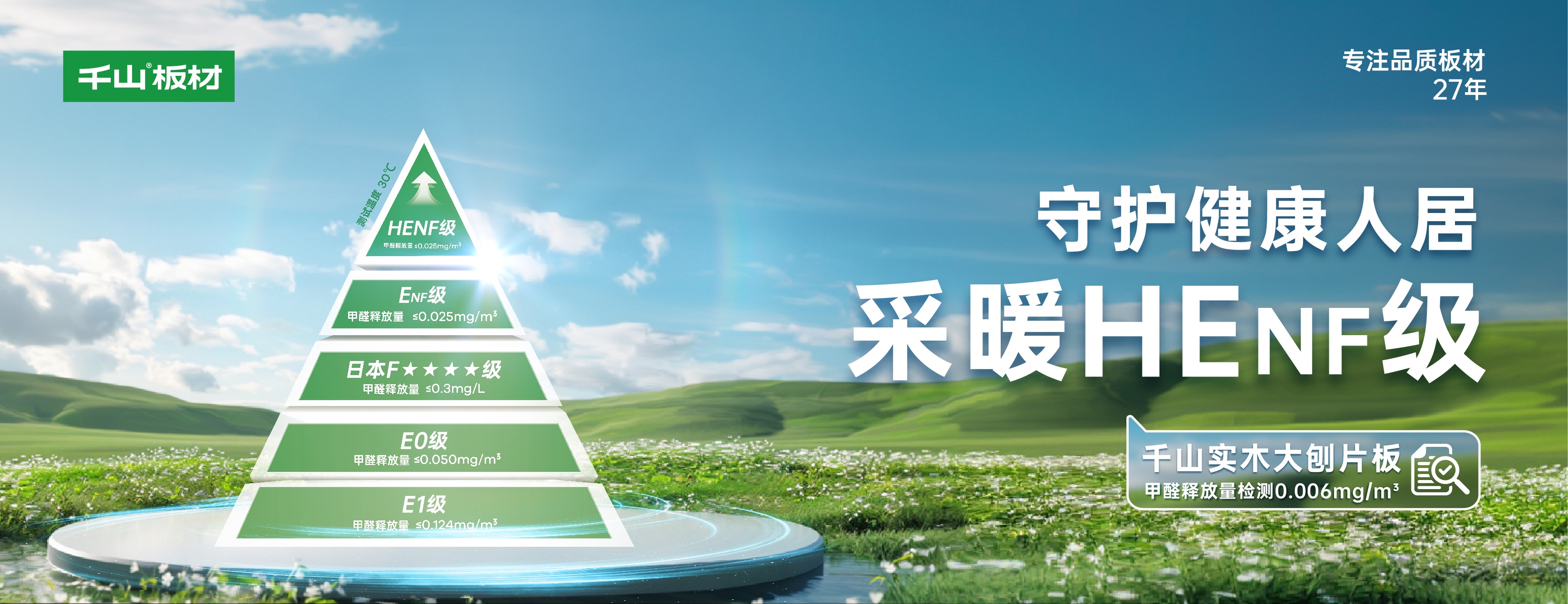 千山HENF級板材憑借其卓越性能,從根源上減少有害物質釋放,為居住者構筑起一道堅實的健康屏障,真正實現"即裝即住"的健康宜居生活愿景。