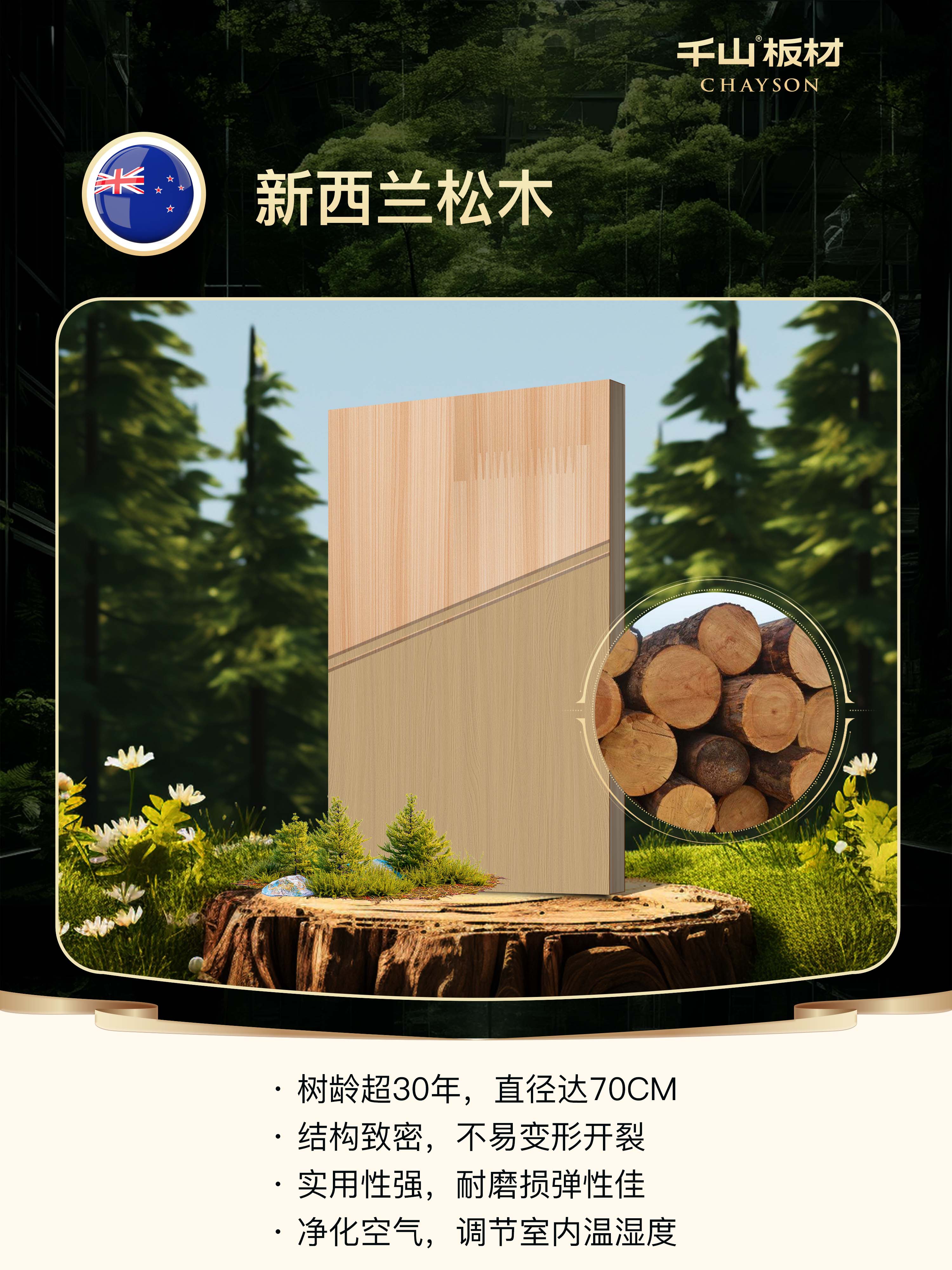 新西蘭松木樹齡超30年、直徑達70CM,結構致密,不易變形開裂,耐磨損且彈性佳,實用性強,穩定性大幅提升。