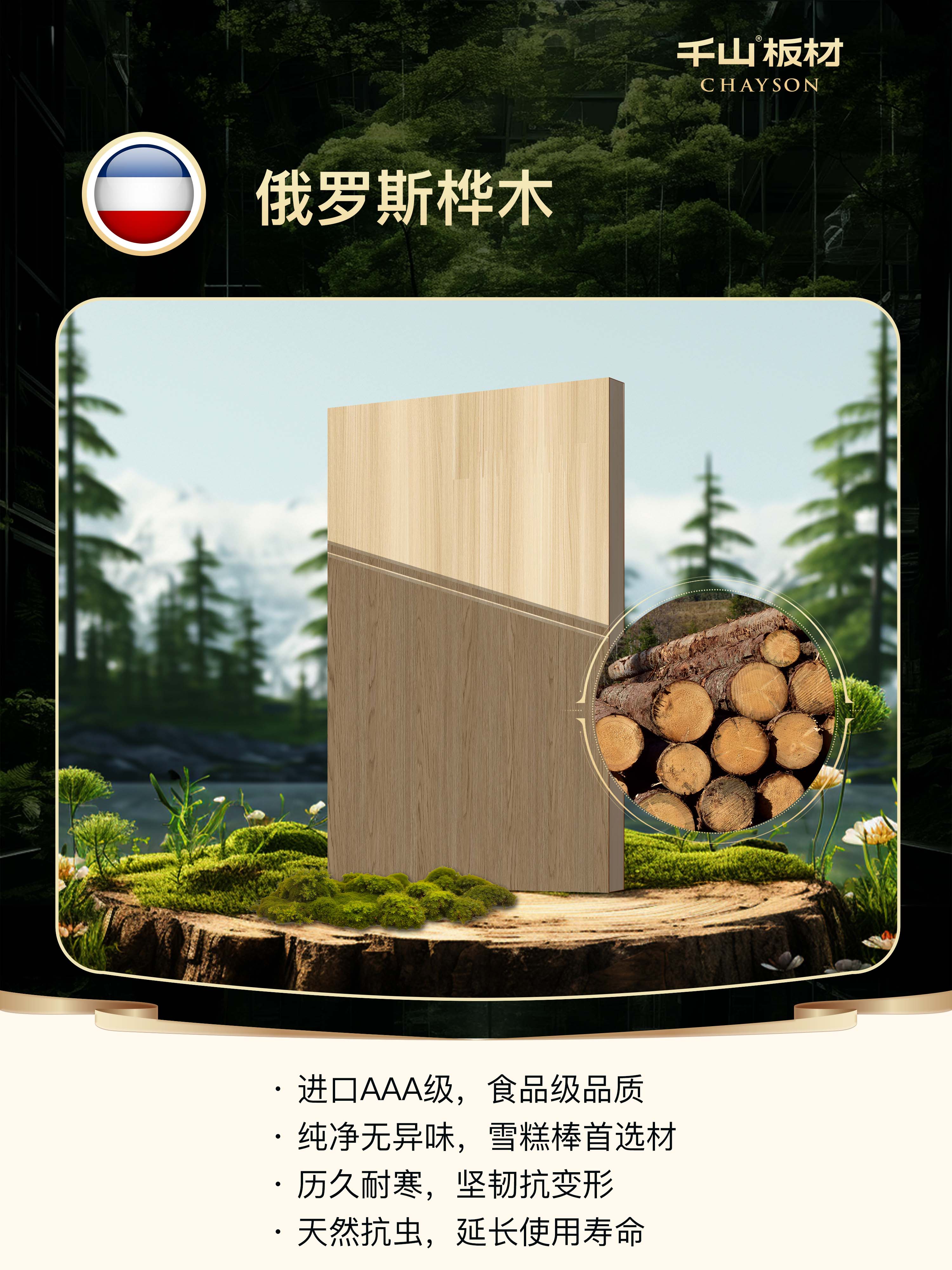 俄羅斯樺木生長在寒冷的環境中,具有更高的密度和硬度,結構致密、材質堅韌,是制作雪糕棒、木砧板等食品用材的理想材料,健康且耐磨耐用。