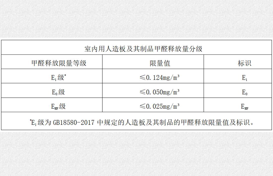 隨著人們生活水平提高,大眾環保意識逐漸增強,為了順應時代需要,2021年10月1日開始,《GB/T 39600-2021 人造板及其制品甲醛釋放量分級》標準文件正式實施,即E1級≤0.124mg/m3、E0級≤0.050mg/m3和ENF級≤0.025mg/m3。