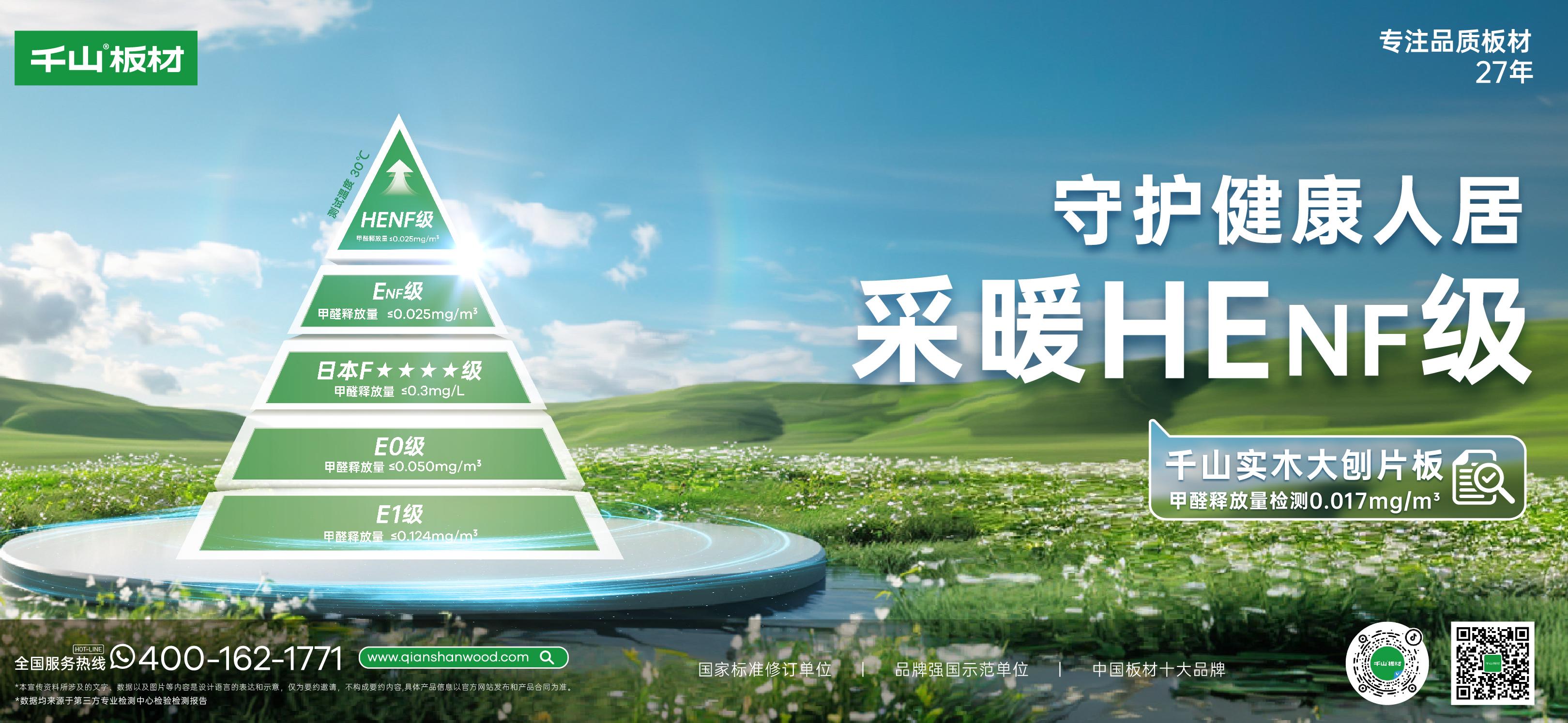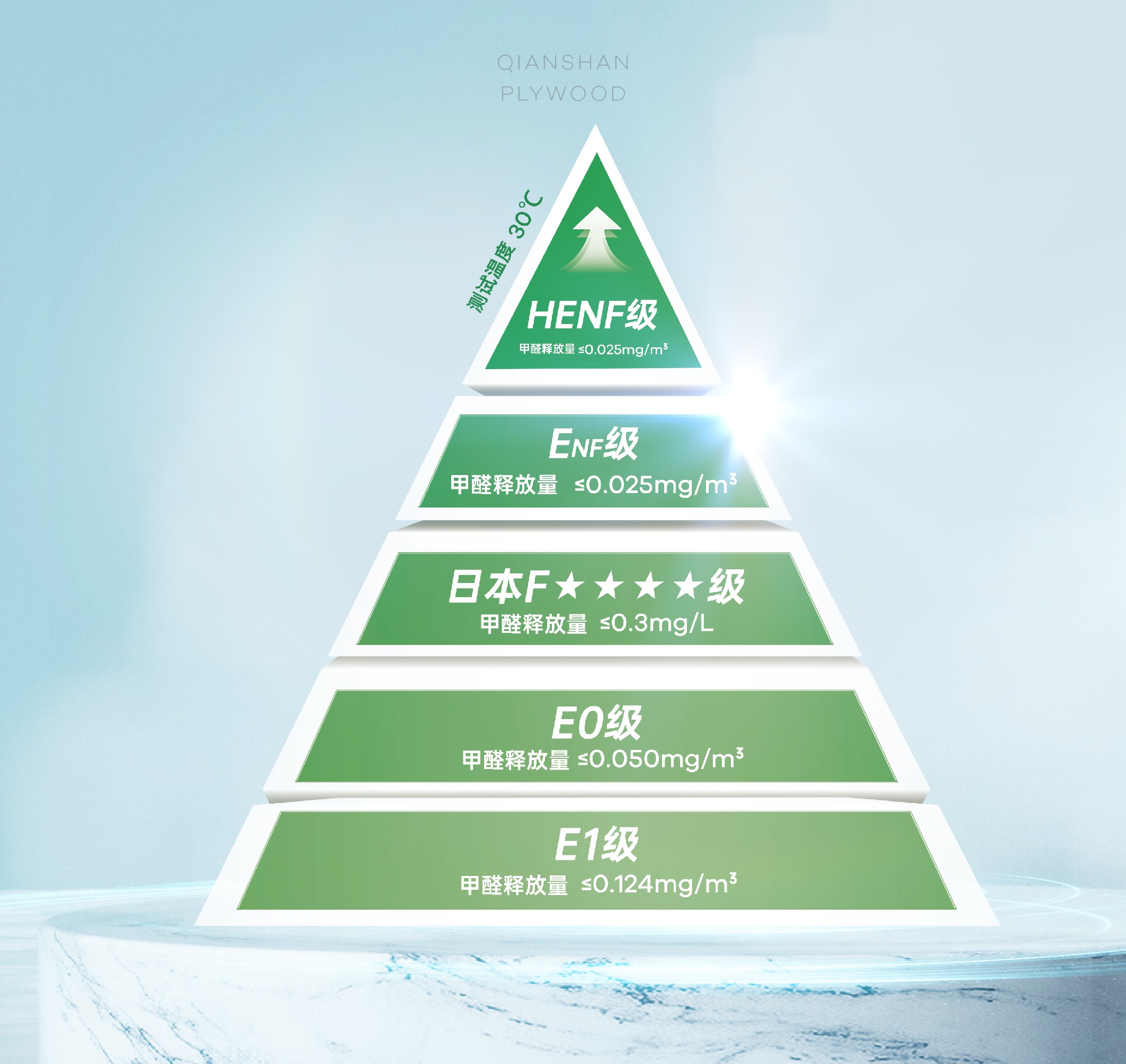 傳統(tǒng)板材環(huán)保標(biāo)準(zhǔn)多聚焦于常溫環(huán)境下的甲醛釋放量,而HEnf級(jí)的甲醛釋放量在30℃熱環(huán)境下被嚴(yán)格限制在0.025mg/m3以內(nèi),是中國林產(chǎn)工業(yè)協(xié)會(huì)于2022年5月31日發(fā)布的《采暖用人造板及其制品中甲醛釋放限量》(T/CNFPIA 1003-2022)標(biāo)準(zhǔn)中的最高等級(jí)。HENF級(jí):環(huán)保的升級(jí)躍遷千山板材四大品類: