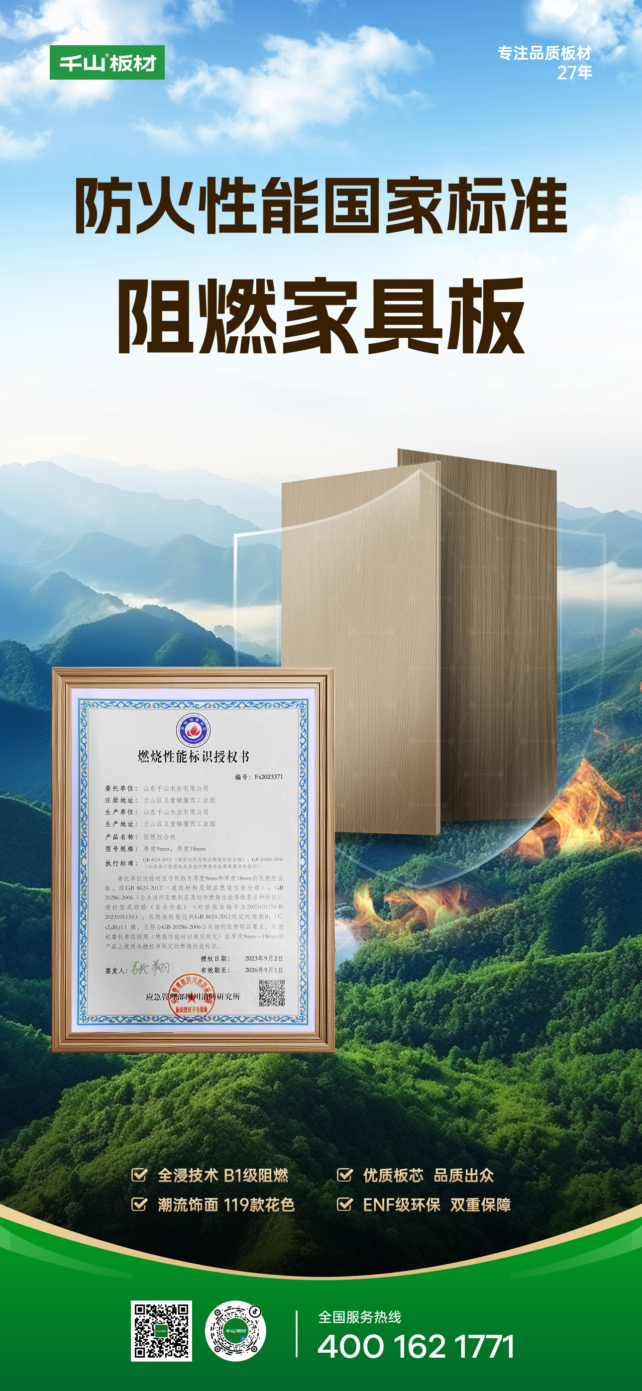 從“符合標(biāo)準(zhǔn)”到“主動(dòng)防護(hù)”,板材安全性能成為大家極為關(guān)注的重要指標(biāo),特別是在家庭環(huán)境中,健康和安全是首要考慮因素。千山阻燃家具板,將科技飾面與安全阻燃技術(shù)相融合,為家居空間“抵抗力”加分。千山阻燃家具板,具有專業(yè)防火阻燃性能,能夠抵御火災(zāi)威脅,為我們的家居空間筑起一道安全防護(hù)墻。 #1 全