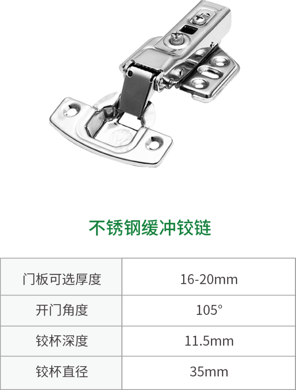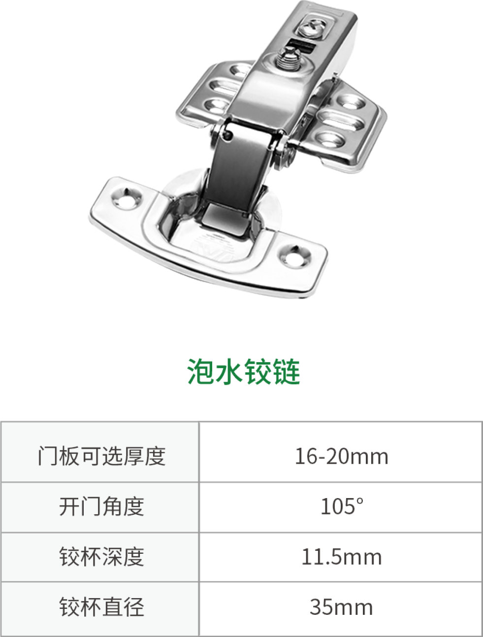 作為定制櫥柜領域內連接柜體和柜門的五金配件,分為可拆卸(自卸)和不可拆卸(固裝)兩個類別和三種規格即中彎(半蓋)、直臂(全蓋)、大彎(不蓋)。